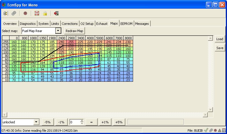 Started out with the standard map again, but with the Noise Abatement turned off, then logged some data with the engine nice and hot, ran it through ECMSpy for Mono beta version and ended up with this:
