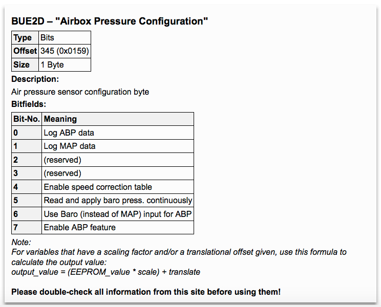 This is the setup I applied to a BUEGB using a Buell OEM air pressure sensor attached to the air box. Value of he airbox pressure configuration byte is 0xC5 (= 11000101 binary).
