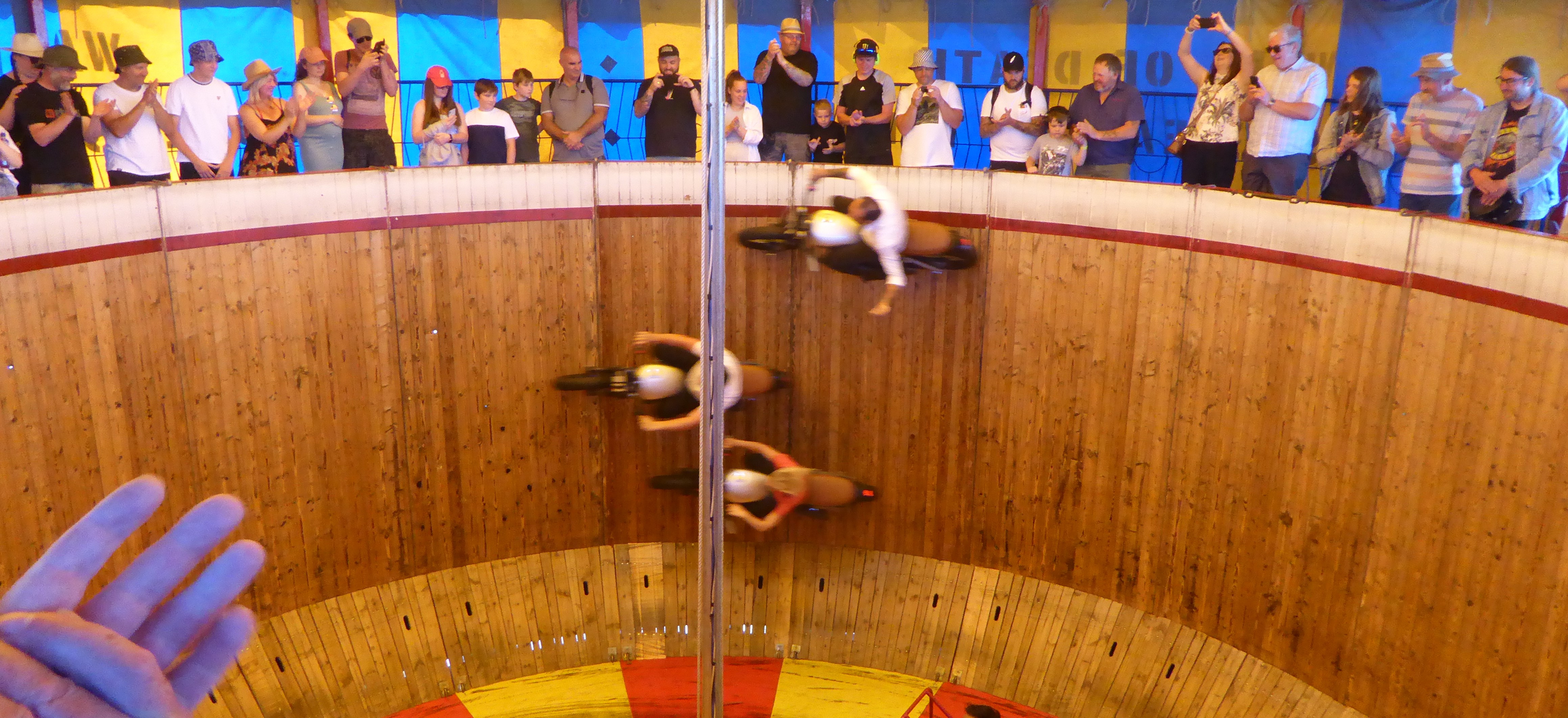 I’ve got to say, Santa Pod was heaving, the camping area was stuffed and we had to thread our bikes through throngs of people, it was more of a family day with stalls and lots of vintage drag cars & bikes both for show & competing. The vibe was as always freindly & after having a quick scout round the stalls, I had spied one of my all time favourites, The wall of death, no way I missing the opportunity to watch this again (last time was 12 years hence at The Cromford steam rally). This show is thrilling for a mere £3.00 & a voluntary donation afterwards towards their injury costs as they can’t get insurance obviously.
