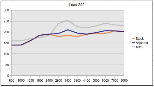 Apparently the valve increases VE (a indicator of the air mass available for combustion) which in sequence would allow to add fuel and increase torque. With the XB12 muffler and the valve motor installed we made a few rides and ended with the switching points shown below, which are not too far away from the simulated results: