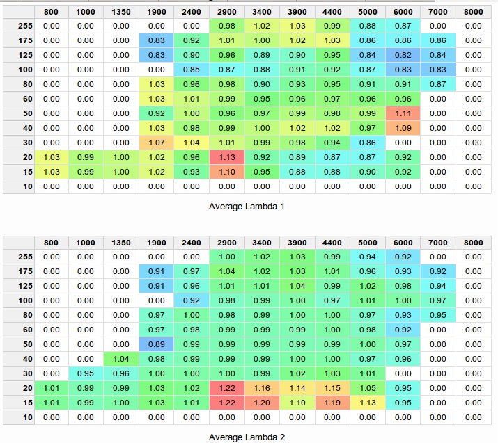 There are apparently some lean spots left, but these numbers are averaged and weighted, so all values must be taken with a grain of salt. With WOT enrichment and open loop correction enabled again, these lean spots will disappear then.