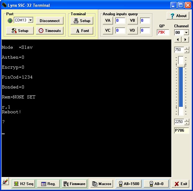 This told the Bluetooth module to 'listen up' and await further instructions. Typing 'd' then [return] pulled up the configuration: